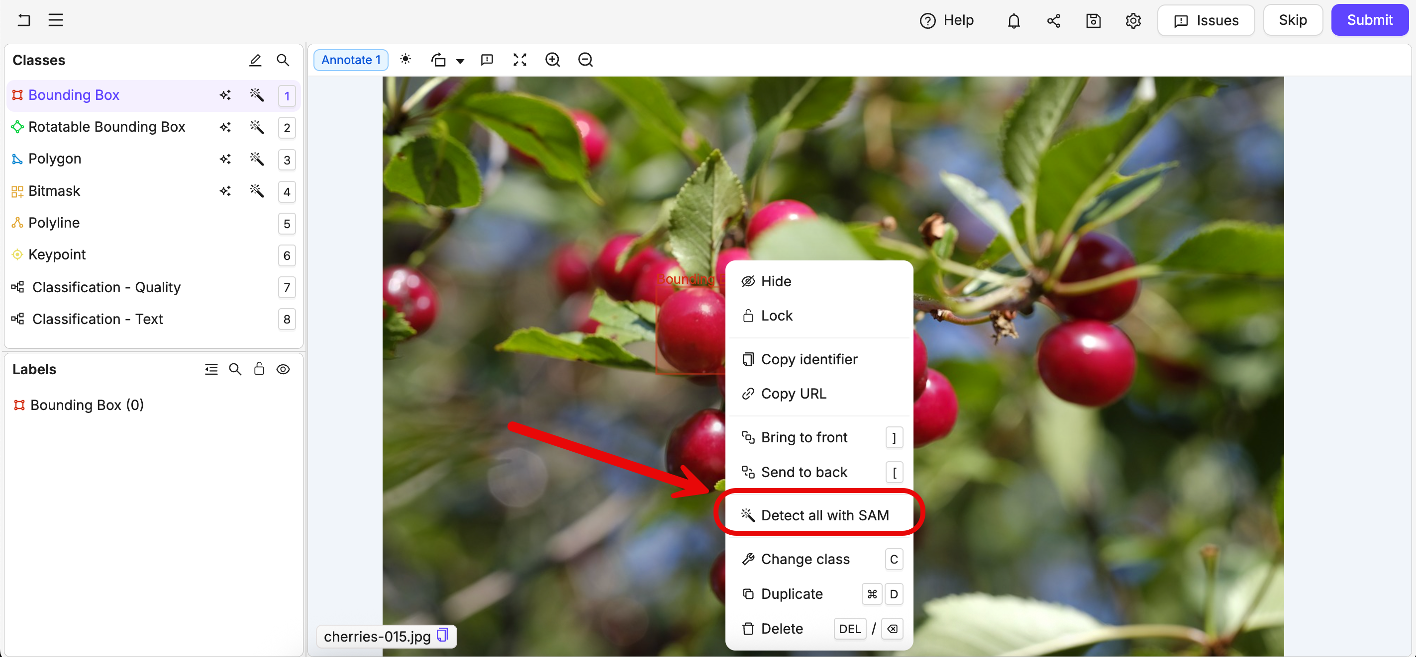 The Detect all with SAM feature allows using one labelled object as a visual prompt to SAM 3 to label all similar objects on an image or a video frame using the same class of label. This is useful for classes that are not readily understood by SAM 3 when using a text prompt.