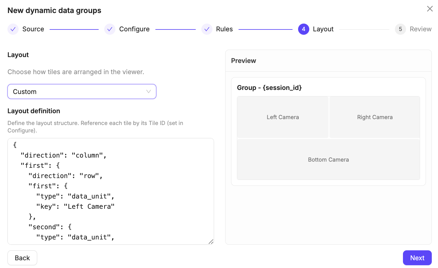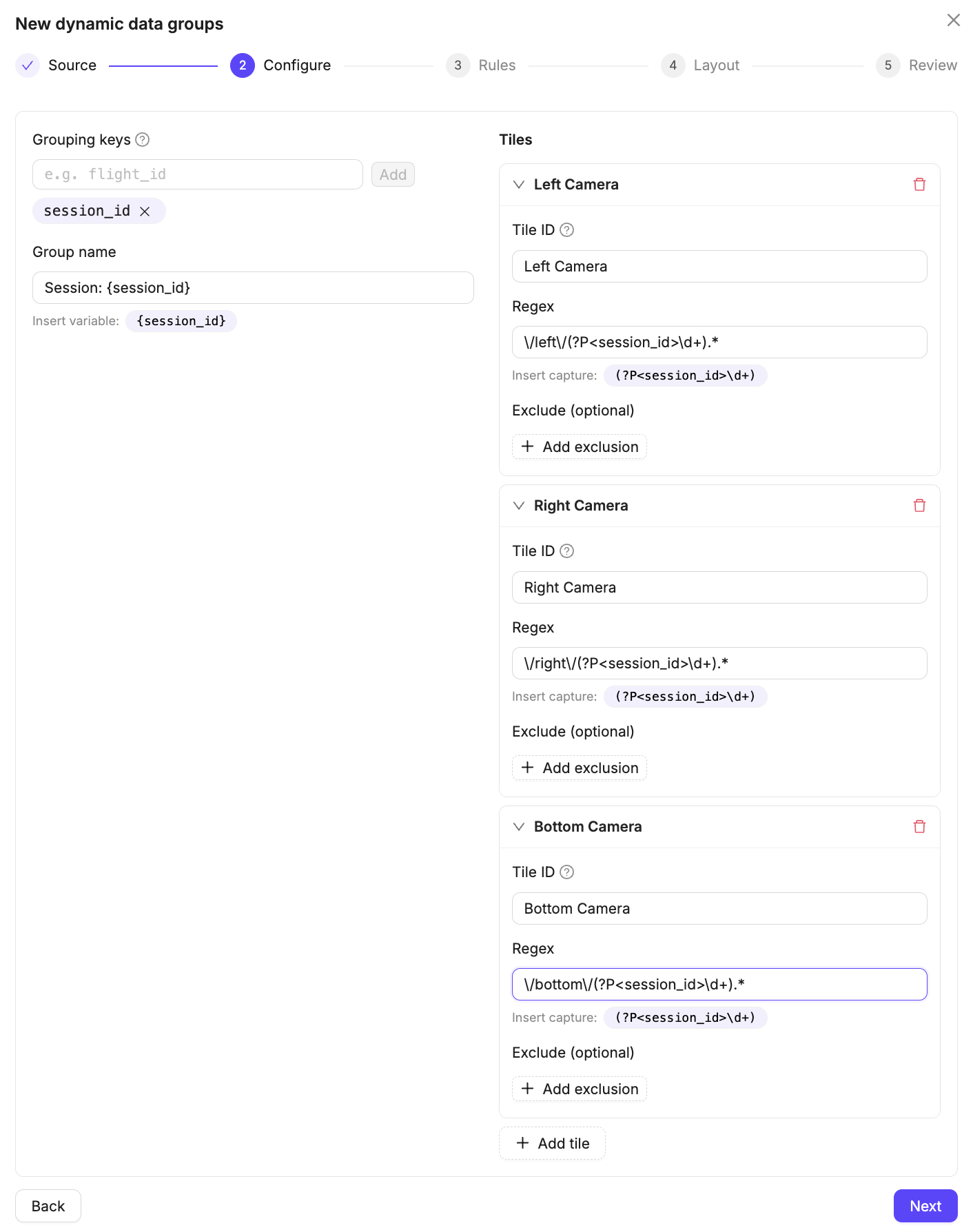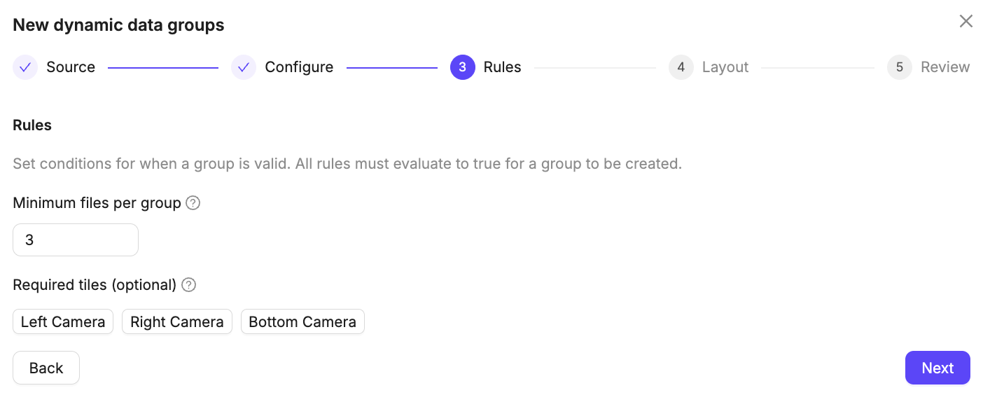 session-0878-camera-left.mp4andsession-0878-camera-right.mp4the grouping key would besession-0878. - Group name: The name of each Data Group. Grouping keys can be referenced as part of the name.
