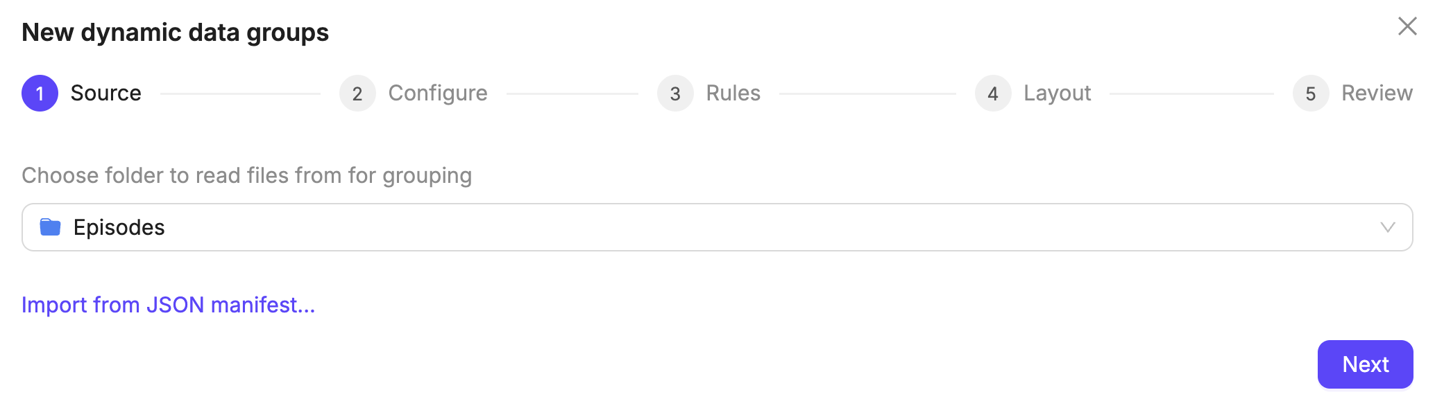 - Select a source folder whose files you want to organize into Data Groups. Each folder supports only one grouping configuration. If the selected folder already has one, it is loaded for you to review and edit.